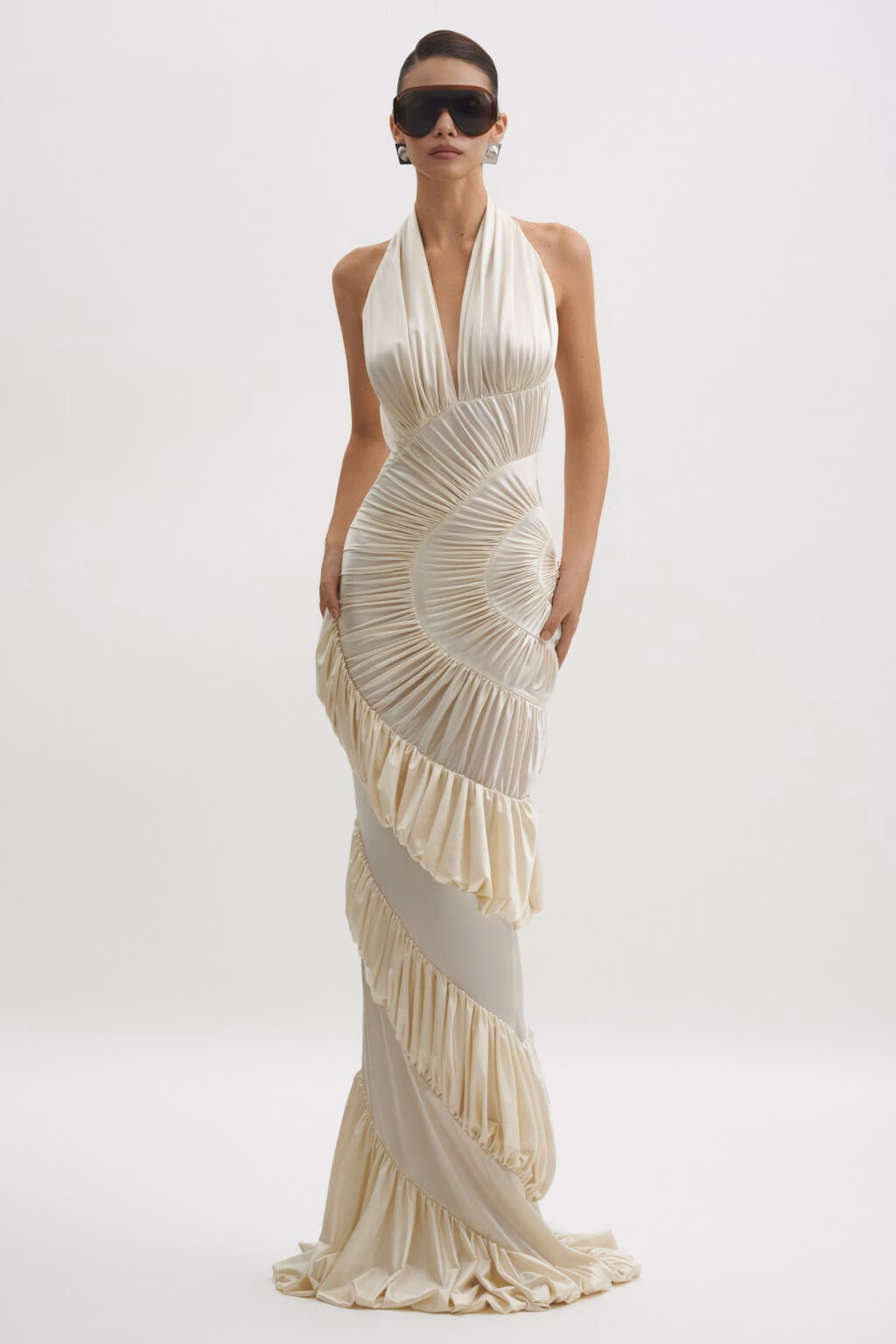 Á hậu Kiều Loan chọn mẫu đầm của thương hiệu Datt, làm từ chất liệu lụa pha spandex màu trắng sữa. Thiết kế xếp nếp vòng cung giúp cân đối tỷ lệ cơ thể, tôn lên chiều cao 1,7m và số đo 80-61-95 cm của cô. Trên website của Datt, mẫu váy được niêm yết giá 18 triệu đồng.